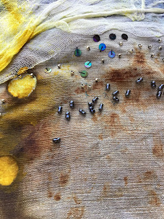 Natural rust dye, textile glue and paint, beads and stitching on very coton and another few devices.